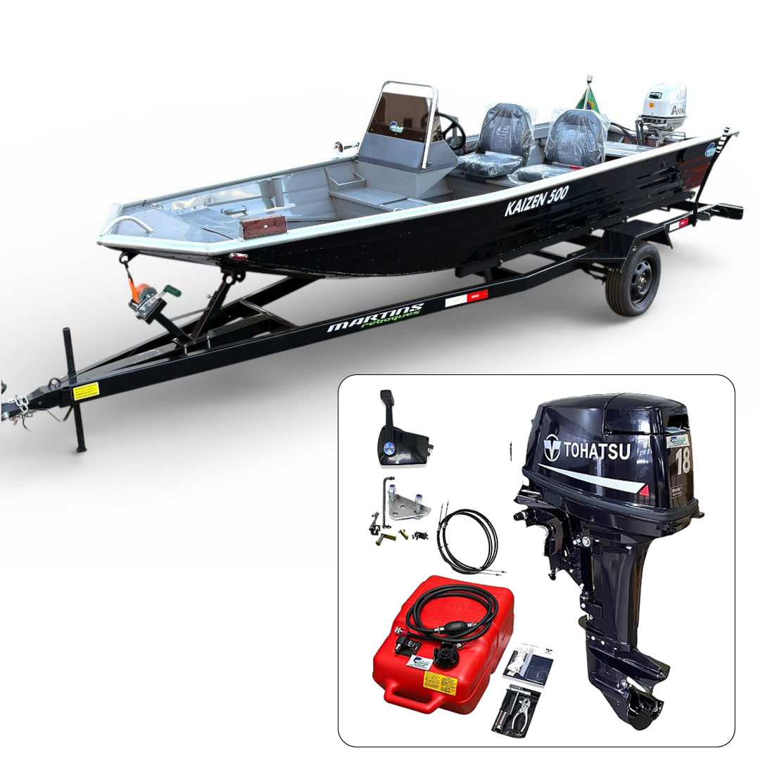 Barco Martinelli Kaisen 500 DC com motor Tohatsu 18 HP Part. Elétrica + Carreta Rodoviária - Preço do motor para PJ ou Produtor Rural.
