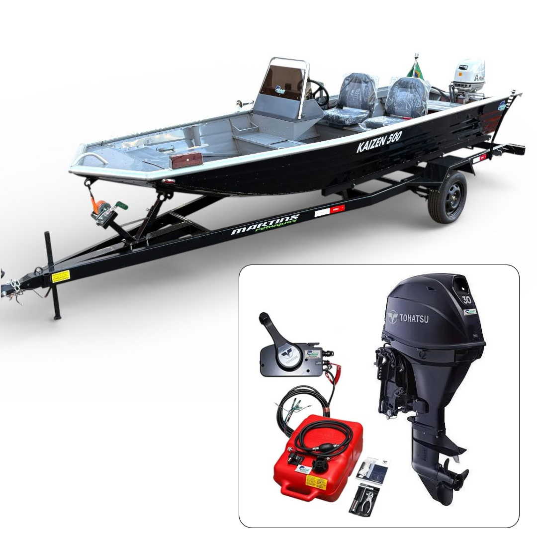 Barco Martinelli Kaisen 500 DC com motor Tohatsu 30 HP 4T Part. Elétrica + Carreta Rodoviária - Preço do motor para PJ ou Produtor Rural